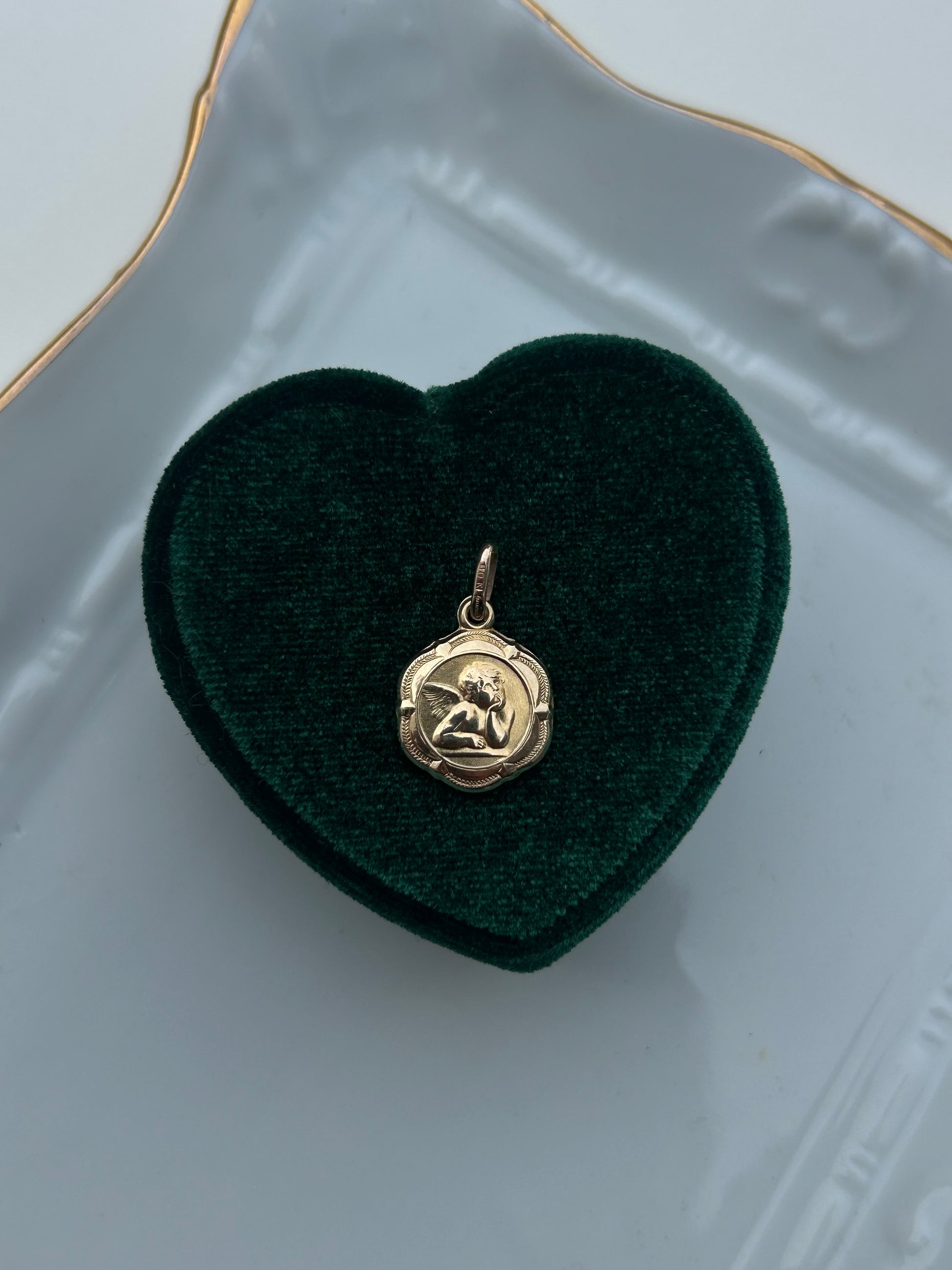 A softly aged 10K gold medallion depicting a serene guardian angel — a quiet emblem of comfort, guidance, and grace. Its smooth frame and subtle engraving give it a time-worn warmth, like something once cherished and meant to be passed on.