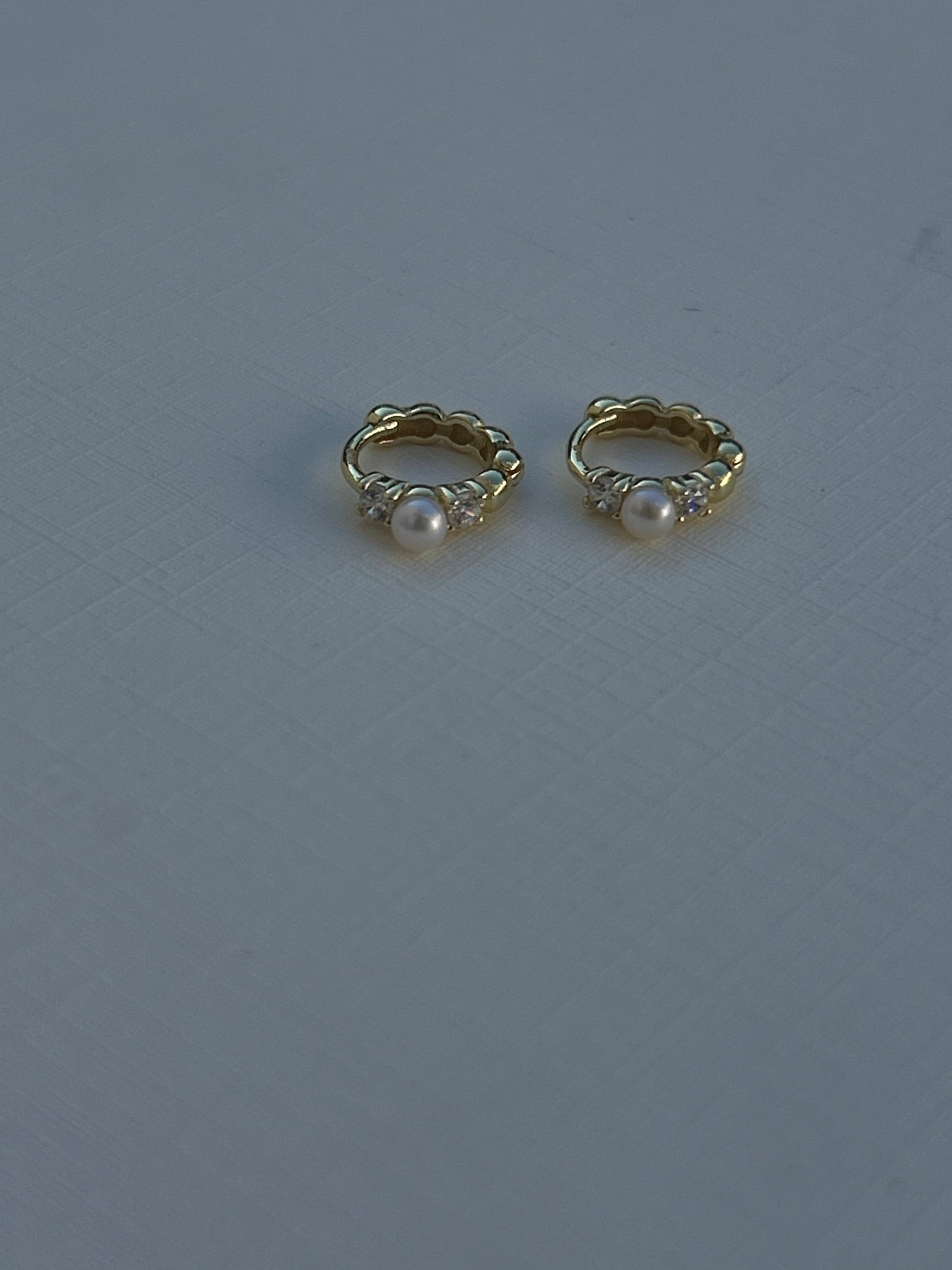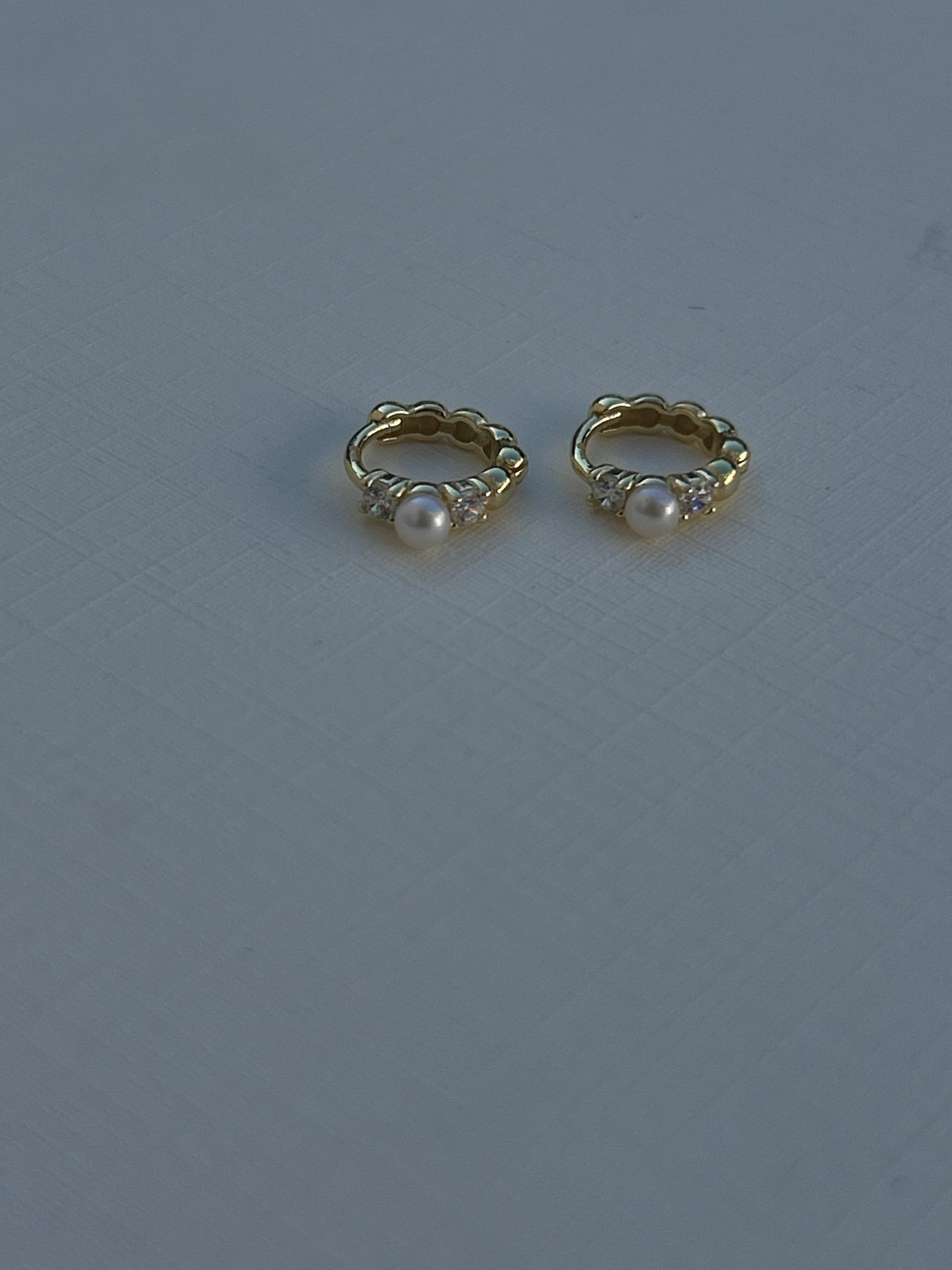 These 10mm gold vermeil huggies feature a beaded band, set with a single pearl and two lab created clear crystals for just a hint of glow.